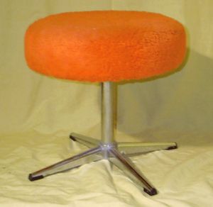 Der orangefarbene Plüschhocker aus den 70er Jahren zeigt dagegen die gewönlichen Gummifüße an seinem chromfarbenen, relativ flachen Drehkreuz (d: 40cm h: 42cm).