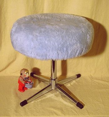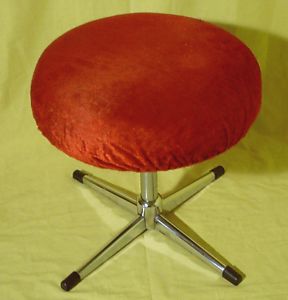 Auch weisen die früheren Modelle der Drehhocker - hier mit rotem Plüschbezug - eine recht hohen Ansatz des Chromdrehkreuzes auf.