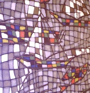 Das wundervolle Segelschiffe-Fische-Motiv der Tischplatte von Nahem betrachtet: Nein, hier sind keine Mosaikfliesen verarbeitet, sondern das strapazierfähige Resopal beinhaltet in einer Zwischenschicht den farbenfrohen Druck. Kratzfest kann auf dieser Tischplatte in typischer goldfarbener Kunststoffleiste jede Leidenschaft gefröhnt werden: Tafeln wie bei den Römern oder pokern wie in einer amerikanischen Spelunke!