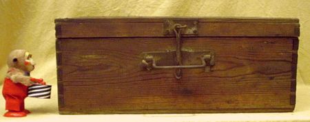 Der Koffer besteht aus massivem, unlackiertem, aber geöltem Weichholz, dessen schwalbenschwanzverzahnten Kanten Stabilität nicht nur versprechen, sondern auch halten (h: 20 b: 51 t: 32 cm).