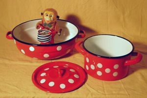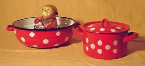 Weiße Punkte in allen Größen auf knallrotem Untergrund. Meine Lieblingsschüsseln -