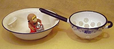 Daneben aufliegend ein Henkelsieb mit blauem Blumenmuster, eine Neuauflage aus den 90er Jahren.