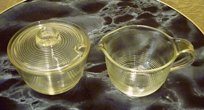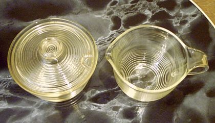 Das Milchkännchen und die Zuckerdose bestehen aus dickwandigem, zartgelb scheinendem Glas,