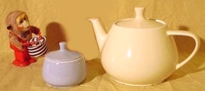 kugelige Teekanne in hellgelb mit hellblauer Zuckerdose von MELITTA.