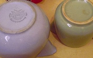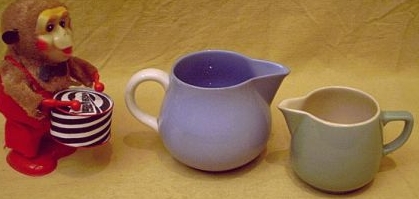 Zwei Milchkännchen aus den 50er Jahren: Links das hellblaue Kännchen mit weißem
