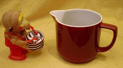 Ein schicker Milchtopf aus Steingut aus den 50er Jahre, innen weiß, außen bordeauxrot,