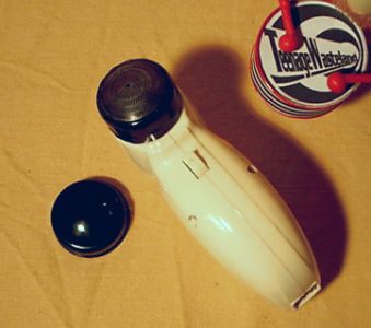 ... das unter sich einen roten Klingenhalter mit vier Klingen birgt. Der Rasierer wird an dem weißen Kippschalter gestartet.