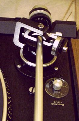 links: Schön gefräste Tonarmaufhängung und der Drehregler für Anti-Skating.