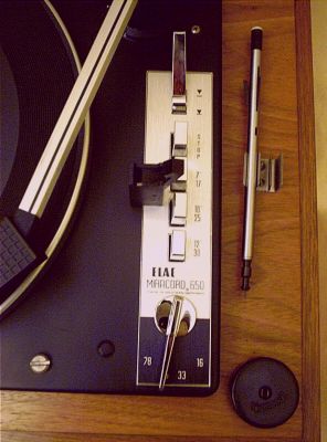 Vorne der Drehhebel für die 4 Geschwindigkeiten (16, 33, 45, 78 upm).