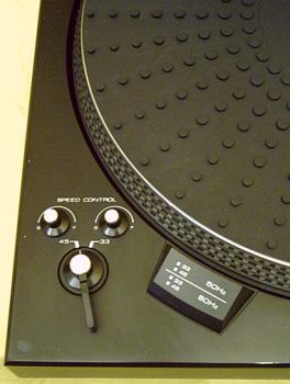 darüber die "Speed Control" Regler für 33 und 45 Umdrehungen.